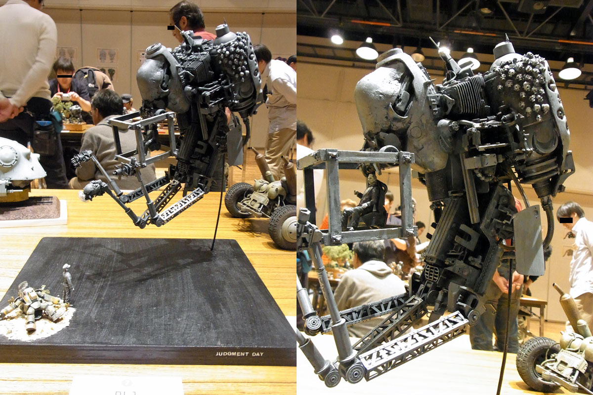 コミティア99に参加してきました。 チャンバー卓の様子はこんな感じで。 以前から作品を見ていた絵描きの方が買いに来て下さった時にはかなりテンション上昇。 頒布した新刊「Ridin' as Bitch」は 現在Plastic Chamberのサイト内で通販を行っております。 会場に足を運べなかった方は是非。 そして今回の通販開始に合わせて stevenさんがHPを更にカッチョ良くリニューアルしてくれました。 多謝!!!! galleryページには以前のサイトには載せていなかったニューフェイスも加わっているので リニューアル前のサイトを見た事がある人も要チェックです。 そしてtwitterのPlastic Chamberのアカウントも密かに始動。 HP更新情報、活動情報やイベント参加情報等、発信していく予定です。 https://twitter.com/plasticchamber PR 去る11月20日に催されたma.k関東展示会に行ってきました。 …今更だけどレポだよ! ツボにきた作品を。 まず初めは、ヨコオさんの「stand by」 半重力装置が発生させる有害なパルスを兵器として転用する… というアイディアが凄い好きです。 メカの中央に人面を配置するインパクトのあるデザインでありながら それでいて締まった雰囲気なのがたまりません。 思わず鬼頭栄作さんの「惑星旅行」のジューコフを思い出しました。 お次は神戸智一さんの「シュトラール軍無人装甲二輪車両」 ボディから前輪にかけてのフレーム部分が特にツボにきました。 台座も作品とマッチし凝っていて好きです。 ノイさんの「スレイプニル」 かなり巨大な作品で未完成ではありましたが、凄まじい迫力でした。 各所に何のパーツが使われているのか非常に気になります… スケキヨさんの「軌道上の怪物」 その巨大もさもさることながら、洗練された曲線が目を惹きました。 佇まいが大変美しかったです。 毒猿さんの「マイオリジナル1(judgment day)」 本体の異形感と細部の密度が凄まじいです。 そして、三本のアームのそれぞれ天国、地獄、転生という役割や モノクロの死後の世界の中で そこだけスポットライトで照らされているかのように塗装されたグスタフなど 模型から物語やバックグラウンドを色々妄想できるような 非常に凝った作品演出に視線を釘付けにされました。 こちらはヤタさんの「I can fly」 全体像の写真を撮り忘れてしまったのですが 凝ったベースや独特なフィギュアにより 独自の世界観がそこに形成されていていました。 錆びた金属や枯れた大地というのもたまりません。 そしてこちらは横山オサムさんの「The Princess&Cyclops」 横山オサムさんが作られる「メカと人」という構図は大変魅力的で 以前製作されていた「POLIZEI GANS」と泣いている少女を題材にした 「Autumn Leaves」でも今回の作品でもそうなのですが 本来無機質なはずのメカに どこか暖かさだったり感情的なものを感じられる構図や 指先一つにまで行き渡っている演出に熱い拘りを感じます。 そしてfgでのma.k.展示会vol1の頃から 僕自身が何かとお世話になっている横山オサムさんが 今回の展示会にてこちらの作品で入賞されたという事で、本当におめでとうございます! 最後は今回の展示会で一番ガツンときた塗装 Lincoln wrughtさんの「Oh My Nutz!」です。 凄い情報量… 塗装工程を見てみたい… 家帰った後も撮影した写真を眺めていました。 前回の展示会では満を持しての新キットの発売ラッシュということもあり 市販のキットを使用して塗装に凝った作品が多かった印象でしたが 今回は、マイオリジナルのラインで攻めている作品が多数あり 個人的に大変見応えのある展示会でした。 会場の照明も暗くもなく、明るすぎるわけでもなく丁度いい塩梅で 良い雰囲気が漂っていました。 そして次こそは…参加を… コミティア無事に終わりました。 コミティアには今までにも何度か足を運んでいたのですが こうして売り手側として参加というのは初めての経験。 コミティアの雰囲気は割とまったりしてるというか 会場内も慌ただしくなくて過ごしやすかったなー。 会場でのPlastic Chamber卓の様子です。 本と一緒に生模型も生展示。 今回の本の表紙が赤だったのでディスプレイも赤を基調に。 チャンバーの二人からも結構好評だったので、気合入れて作った甲斐があったってもんです。 やっぱ立体物の展示はかなりインパクトがあるようで、会場内でも結構好感触な感じでした。 即売会で模型展示なんて、どアウェーになるんじゃないかと思ってたんですが 意外や意外、購入されるだけでなく、声をかけてくれる方や写真を撮っていかれる方もいて コミティアのフトコロはあたたかかったです。 ありがとうございます。 次の本のネタも決まってるので今後もガンガン行きたいところですね。 大分遅くなりましたが去る11月27日、関東展示会に行ってきました。 少し前から今年の展示会を見に行こうかどうか迷ってはいたのですが 当日の朝、ツイッターでブンさんも参加されるという事を知り、その瞬間即決断。 京都駅に走り新幹線に飛び乗り東京へ。 やっぱイベン